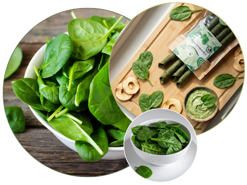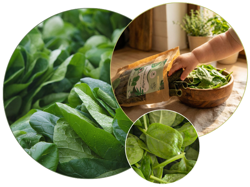 Rollsy™ powstają w procesie delikatnego suszenia musu szpinakowego w niskich temperaturach. Dzięki temu zachowujemy to, co w nim najcenniejsze – naturalne witaminy, minerały oraz intensywny, słodki aromat.